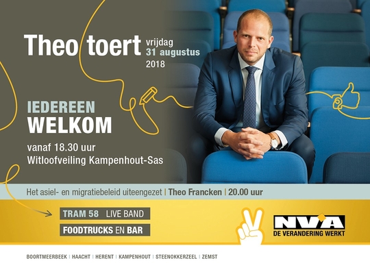 Theo toert. Theo Francken, staatssecretaris voor asiel en migratie en administratieve vereenvoudiging, zet het asiel- en migratiebeleid uiteen in de veiling van Kampenhout-Sas op vrijdag 31 augustus om 20 uur (deuren 18u30).